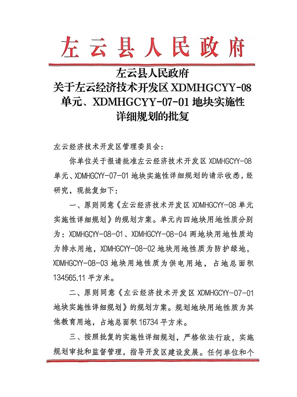 左云縣人民政府關(guān)于左云經(jīng)濟(jì)技術(shù)開發(fā)區(qū)XDMHGCYY-08單元、XDMHGCYY-07-01地塊實(shí)施性詳細(xì)規(guī)劃的批復(fù)